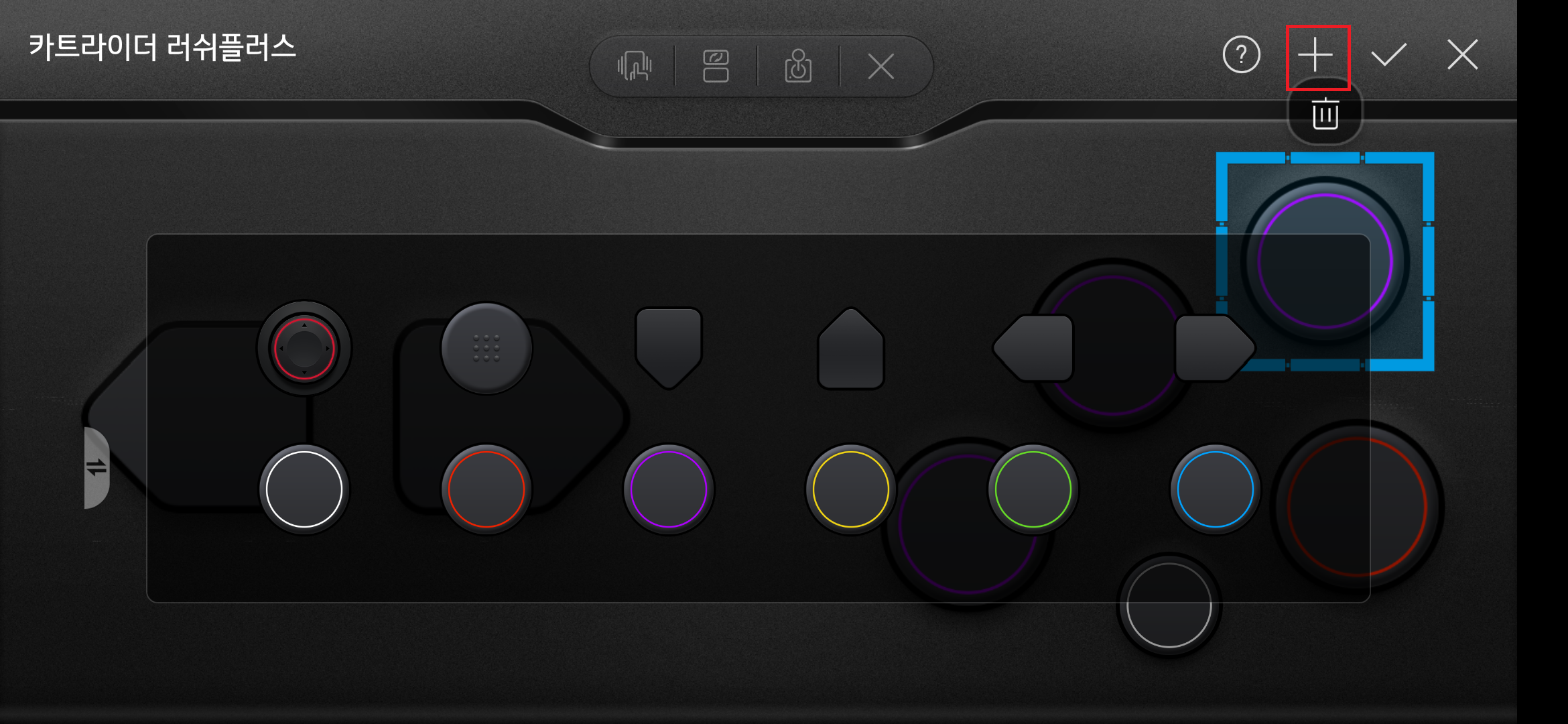 그러면 버튼이 없는 빈화면이 출력됩니다. 그 상태에서 왼쪽상단의 + 버튼을 선택하면 자신의 원하는 버튼을 선택하고, 원하는 위치에 놓을수 있습니다. 선택후 버튼을 줄이거나 크기를 늘릴수도 있습니다.