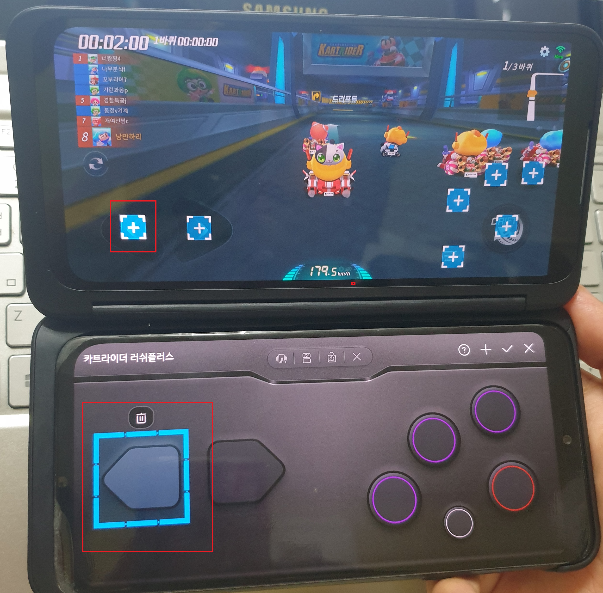 버튼을 모두 디자인하였다면, 실제로 만든 버튼과 게임내 버튼을 연결하는 작업을 진행합니다. 스마트폰에서 자신이 만든 버튼을 선택하면 듀얼스크린에는 연동할 버튼이 활성화가 됩니다. 이 연동할 버튼을 원하는 위치에 놓습니다.