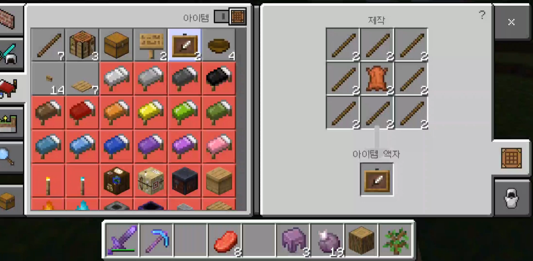 아이템 액자는 가죽1개 막대기 8개가 필요하기 때문에 나무를 캐실 때 여유 있게 캐시는 것을 추천해드립니다.
