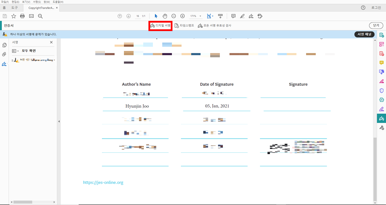 대부분 무시해도 서명하는데는 큰 지장이 없기 때문에 서명 버튼을 클릭합니다.