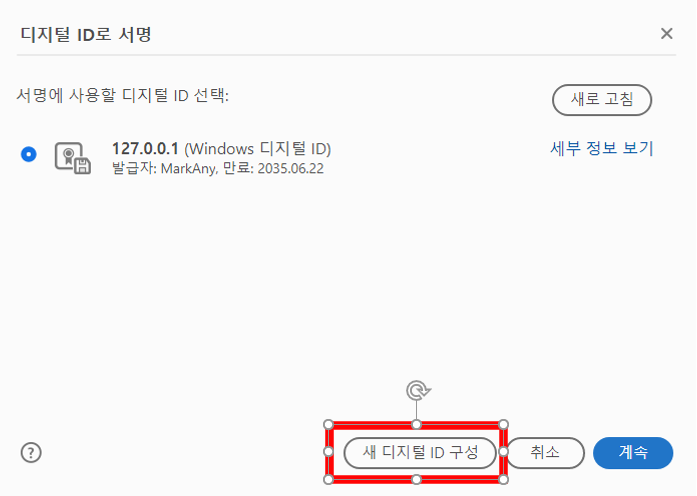 디지털 서명의 팝업창이 출력이 됩니다. 우리는 미리 생성한 디지털 서명이 없기 때문에 '새 디지털 ID 구성'을 클릭합니다.