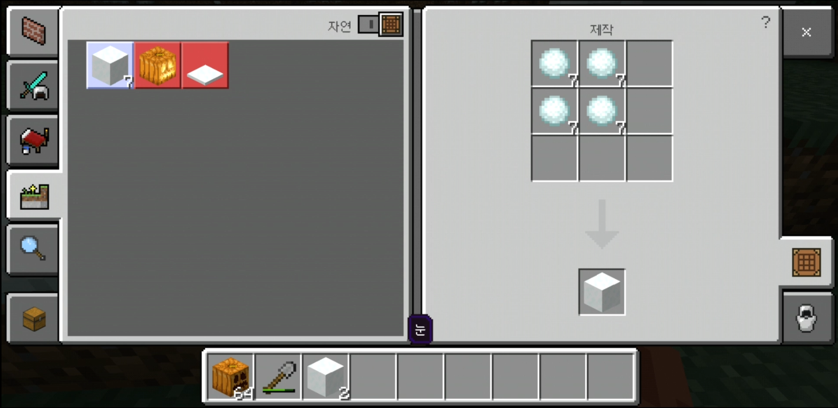 4. 제작대에서 눈덩이 4개로 눈 블록 1개를 생성할 수 있습니다.
