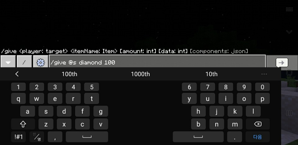 예를 들어서 /give @s [아이템 이름] [수량]을 입력하면 자신에게 아이템이 지급 됩니다. 아래 명령어로 처럼 다이아몬드를 100개 자신에게 지급 할수 있습니다.