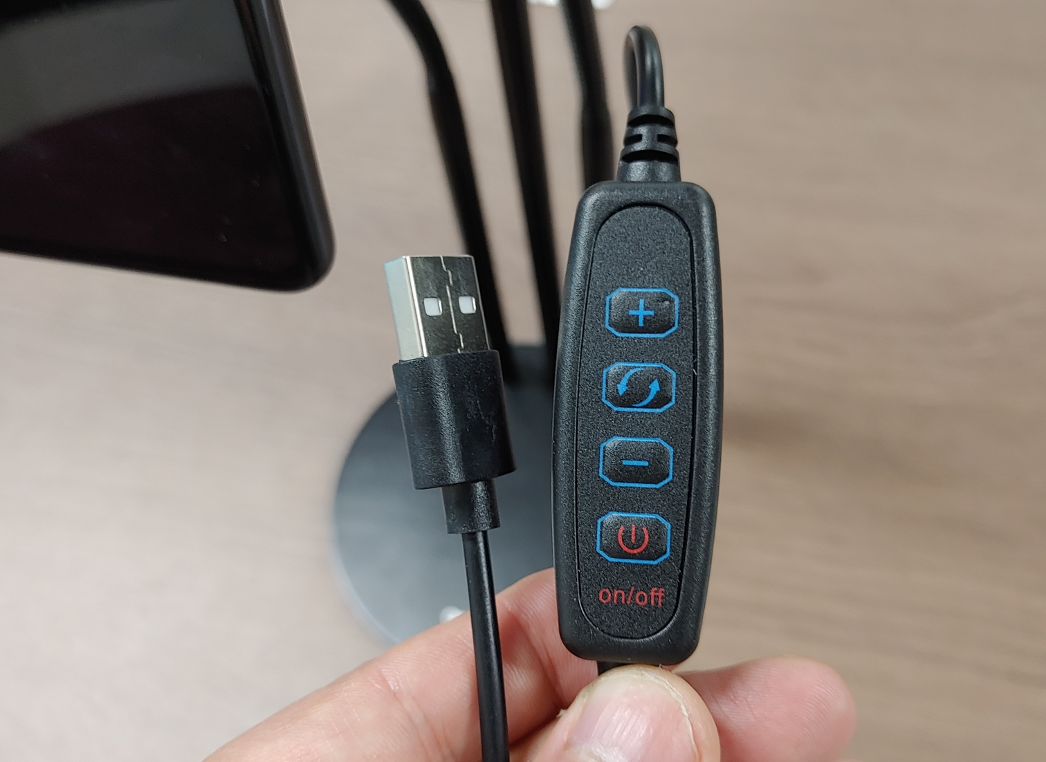 LED의 전원 테스트를 위해서 저는 USB 단자를 노트북에 연결하여 테스트 했습니다 +,-밝기 조절 , 회전 아이콘은 주황등광, 형광등 전환, 맨하단의 전원 버튼을 누르면 LED가 on off 됩니다.