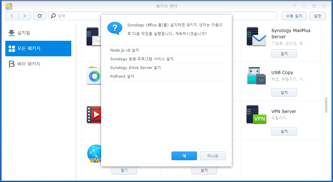 Node, 시놀로지 응용 프로그램 서비스, 시놀로지 드라이버 서버, 파이썬3를 같이 설치해야 시놀로지 office를 사용할 수 있습니다.
