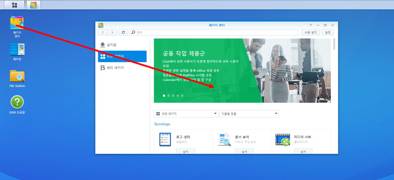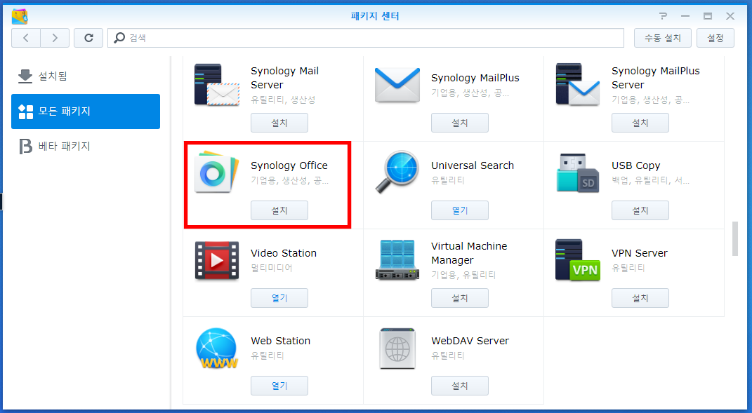 2. 시놀로지 오피스 (Synology Office) 찾고 설치 버튼을 클릭합니다.