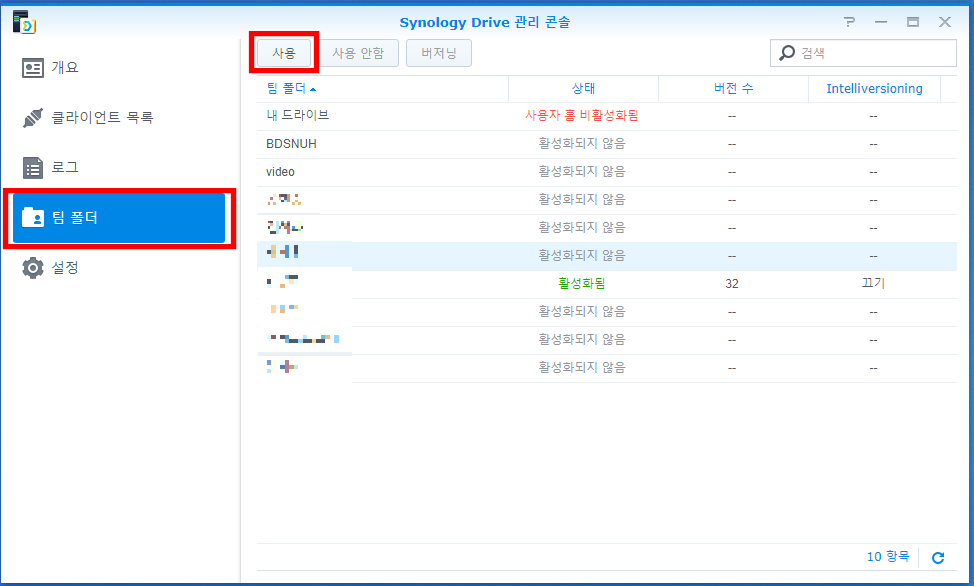 5. 팀폴더 -> 폴더 선택 -> 사용 버튼 클릭합니다.