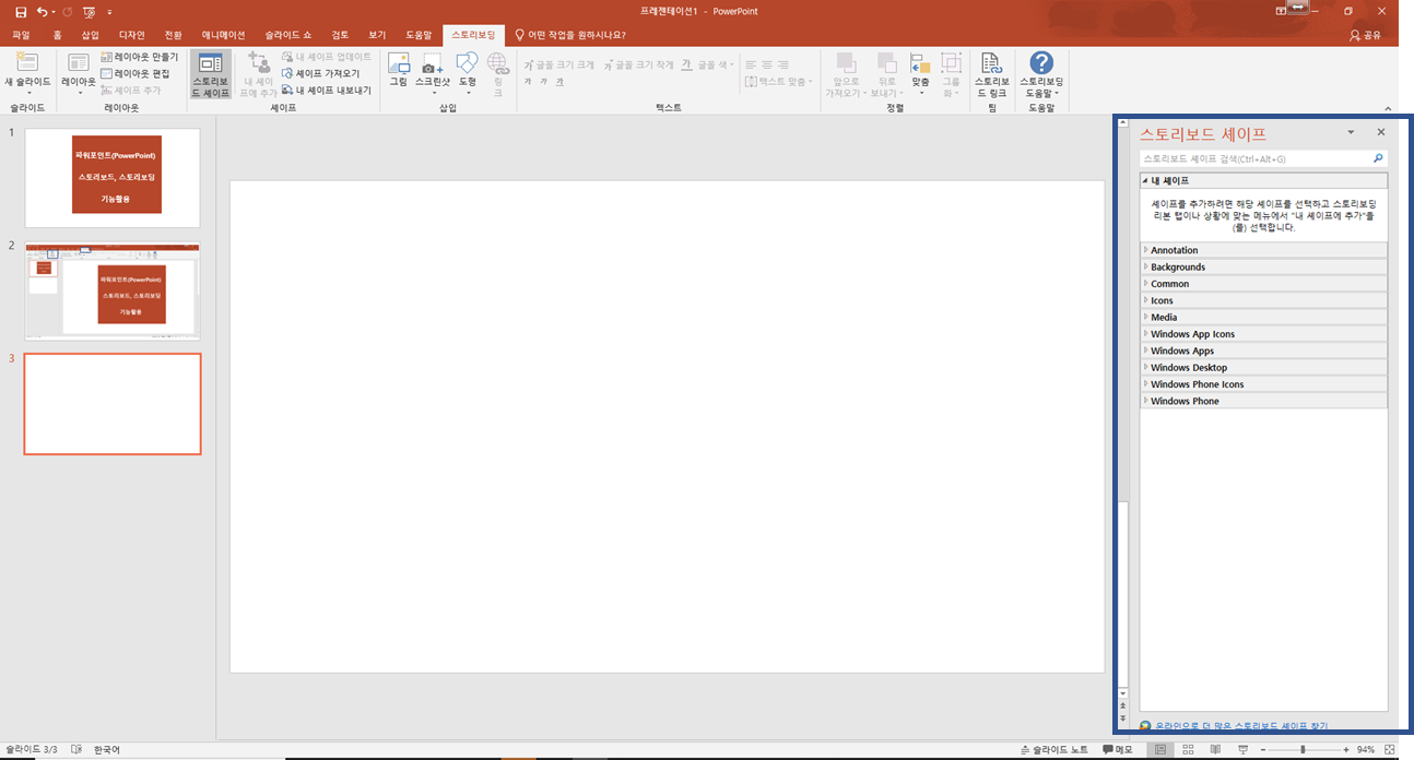 파워포인트(PowerPoint) 화면 오른쪽에 파란 박스와 같이 스토리보드 셰이프가 출력됩니다.