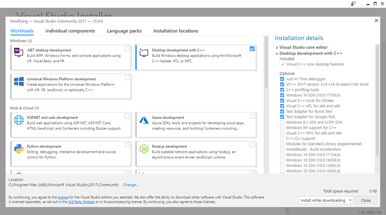 Select Desktop development with C++ and click on Install at the bottom-right corner of the page. (In the above screenshot you see a Close button instead since I have already installed it.)