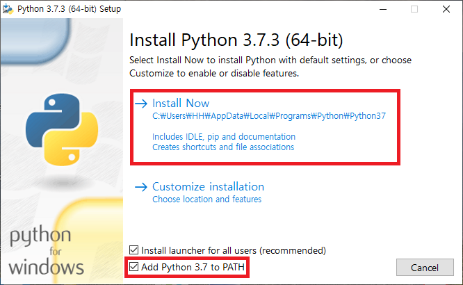 3. 환경변수 설정을 해주는 Add Python 3.7 to PATH 를 선택하여 Install Now 로 설치를 시작합니다.