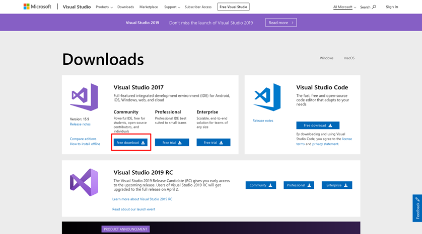 Go to the download page and click on Free download under Community in the Visual Studio download section. This is illustrated in the following screenshot: