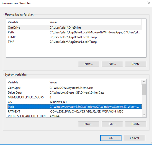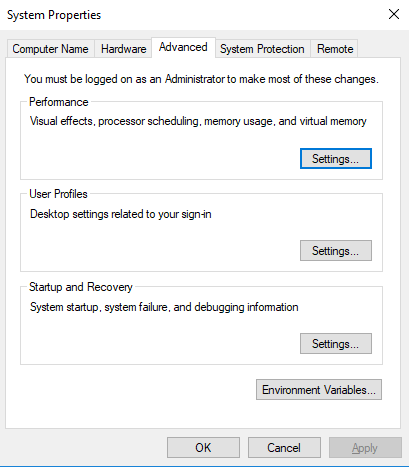 Click on the Environment Variables... button in the bottom-right corner. The following window should appear: