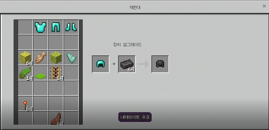 지옥에서 치열한? 전투를 거쳐서 네테라이트 주괴 재료를 얻으셨다면 다음과 같은 방법으로 장비를 업그레이드를 할수 있습니다. 이때 다이아 장비가 있어야 업그레이드가 가능합니다.