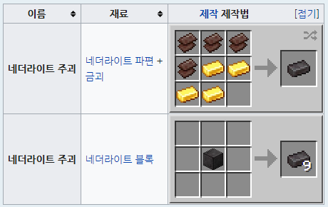 네테라이트 주괴를 만드는 방법은 아래 그림과 같이 네더라이트 파편 또는 + 주괴 또는 네더라이트 블록이 필요합니다.