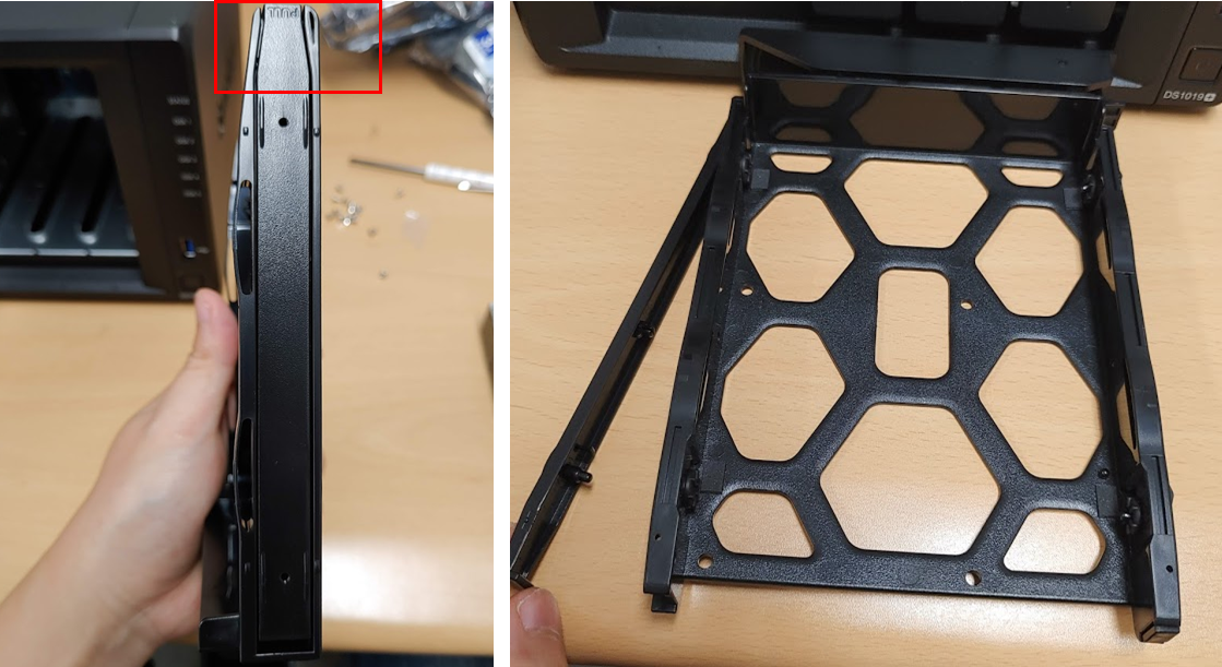 이제 하드디스크를 넣어보겠습니다. 그림과 열쇠 구멍 밑으로 손을 넣고 들어 올립니다. 그럼 덜컥하는 소리와 함께, 하드디스크가 열리며, 손으로 잡아 당겨 트레이를 빼줍니다.
