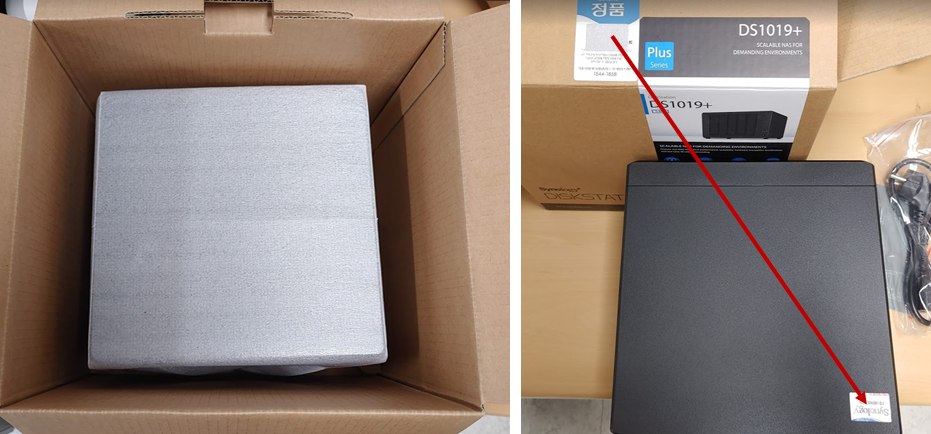 그다음 밑을 보시면, 아래와 같이 NAS가 잘 포장되어 있습니다. 혹시 모를 A/S를 대비하여 비늘을 뜯고 저는 박스 상단에 붙어 있는 정품인증 스티커를 나스에 먼저 붙였습니다.