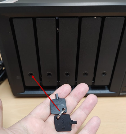 자 이제 본격적으로 설치를 시작 해봅니다. 먼저 구성품중 열쇠가 있습니다. 열쇠로 하드디스크를 잠그고 열수 있습니다. NAS 구멍마다 넣고 돌리면 나스가 빠지지 않도록 되어 있습니다. 저는 굳이 열쇠를 사용할 필요가 없어 사용하지는 않고, 잘 보관만 해두었습니다.