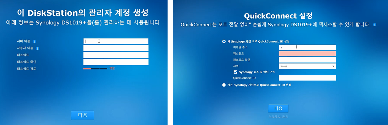 마지막으로 자신의 관리자 계정과 QuickConnect의 정보를 입력하면 설치가 완료 됩니다.