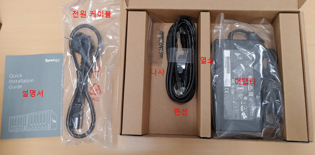 박스를 개봉하면 상단에 다음과 같은 구성품들이 들어 있습니다. (전원케이블, 설명서, 나사, 열쇠, 랜선)