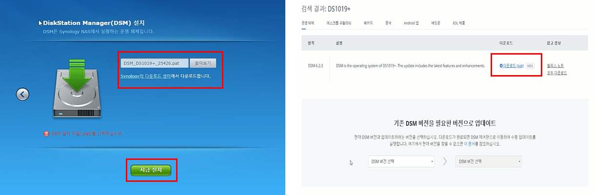 그럼 OS를 다운로드 받을수 있는 창이 출력됩니다. 시놀로지의 다운로드 센터에서 다운로드 합니다를 선택하면 자신의 NAS기종에 맞는 링크가 자동으로 연결되며, OS를 다운로드 받고, 첨부 후 지금 설치 버튼을 클릭 합니다.