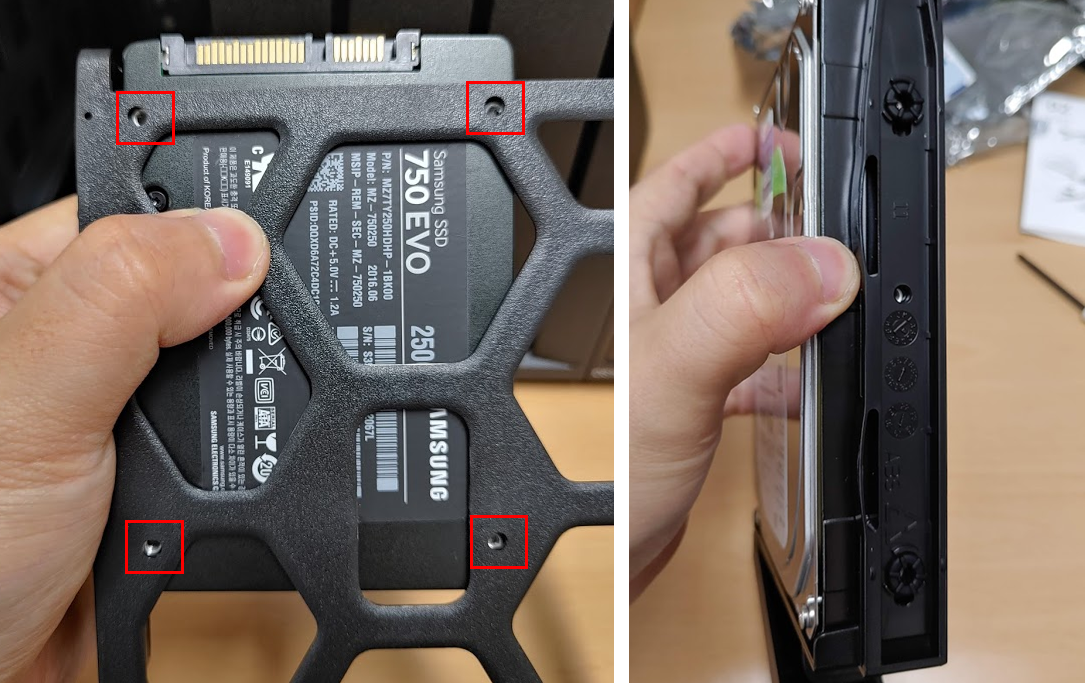SSD는 한쪽 측면을 풀어서 밑바닥에 나사를 연결하고, 일반하드디스크는 나사없이 고무밴드로 편하게 탁부착이 가능합니다.