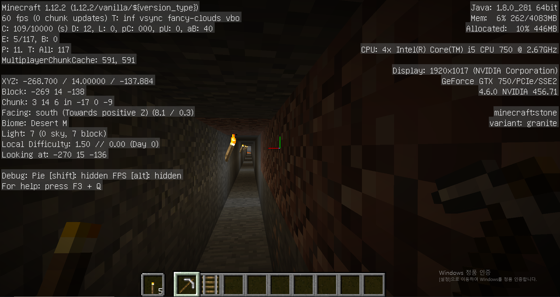 1. F3 버튼을 누르고 나의 Y 좌표를 확인합니다. (현재 73)