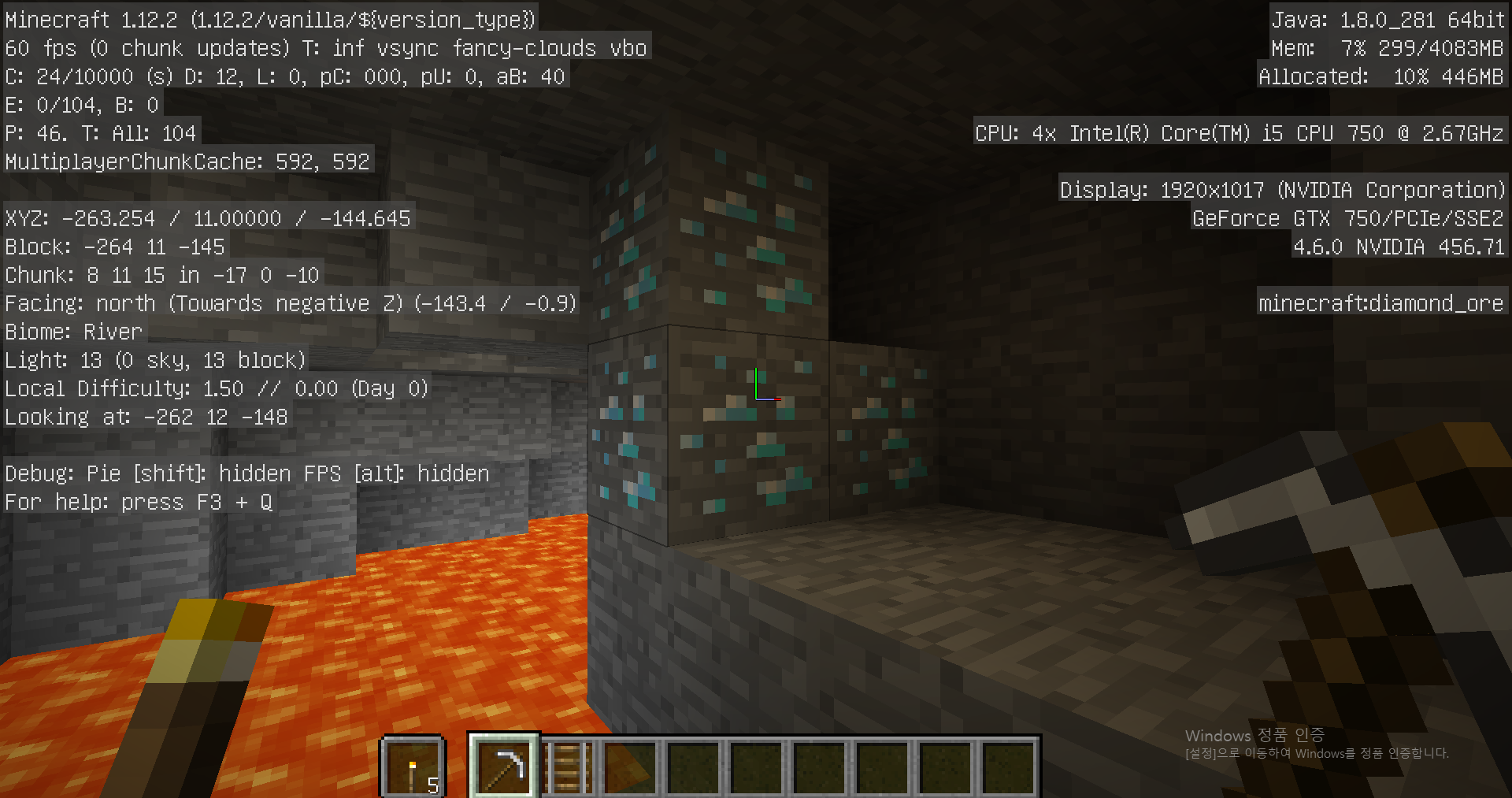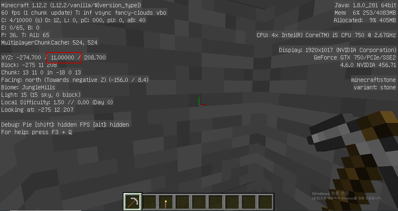 1. F3 버튼을 누르고 나의 Y 좌표를 확인합니다. (현재 73)