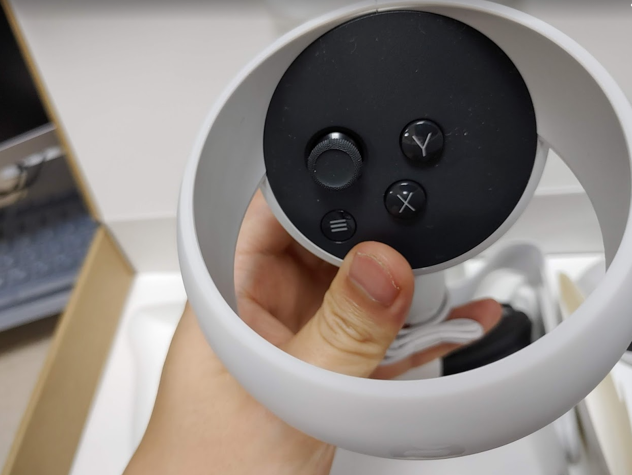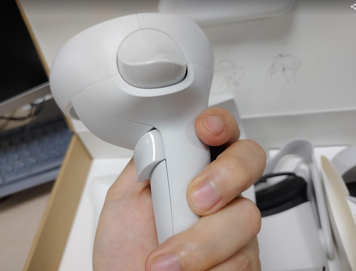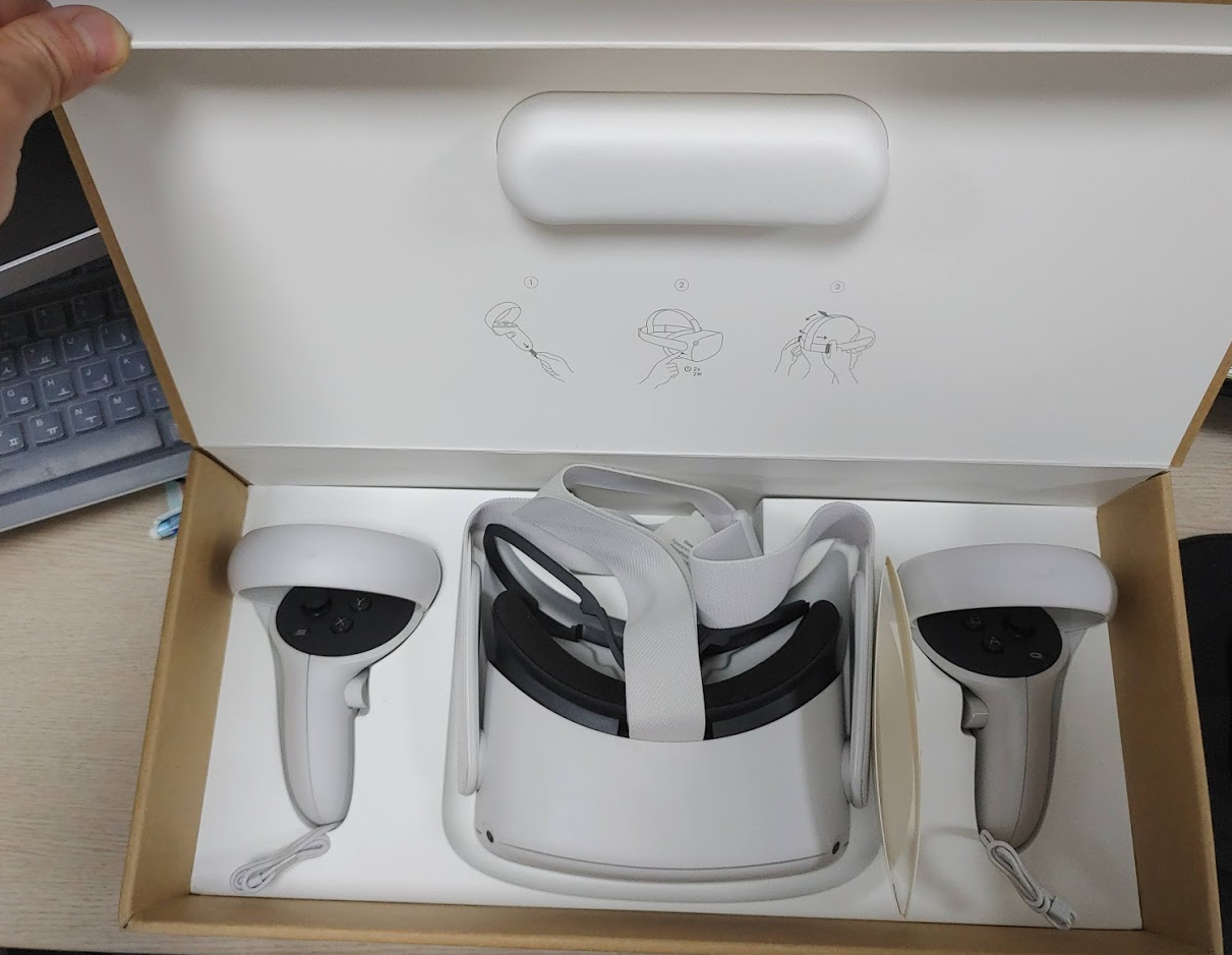 박스를 개봉하면 아래와 같이 헤드셋과 컨트롤러가 있습니다. 오큘러스 퀘스트에서 핸드 트래킹을 제공하면서부터 컨트롤러가 필요 없을 만큼 잘 동작합니다. 몇 년 후에는 컨트롤러가 없을 수도 있겠다는 생각을 했습니다.