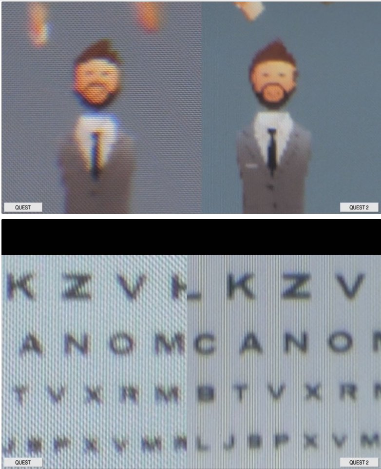 그렇다면 차이점은 무엇이 있을까요? 하드웨어의 해상도가 올라갔습니다. 하지만 아직도 HD수준에 미치지 못한다고 합니다. 오큘러스 퀘스트 2는 4K 해상도 지원이 가능한 1832*1920화 소로 90Hz까지 지원하지만 퀘스트의 기기 성능이 모바일 칩 기반이라 떨어지기 때문에 디폴트로 저하를 걸어둔 거 같습니다.