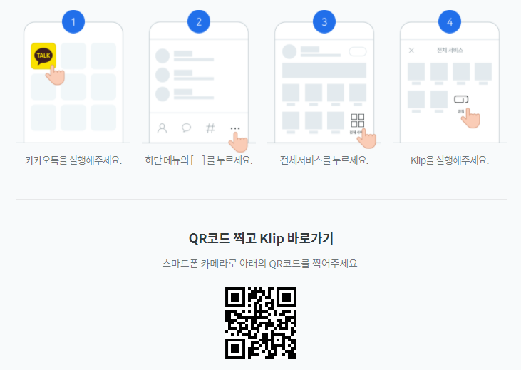 1. 하단의 QR코드를 스캔하거나 카카오톡에서 메뉴로 이동하여 클립을 실행합니다.