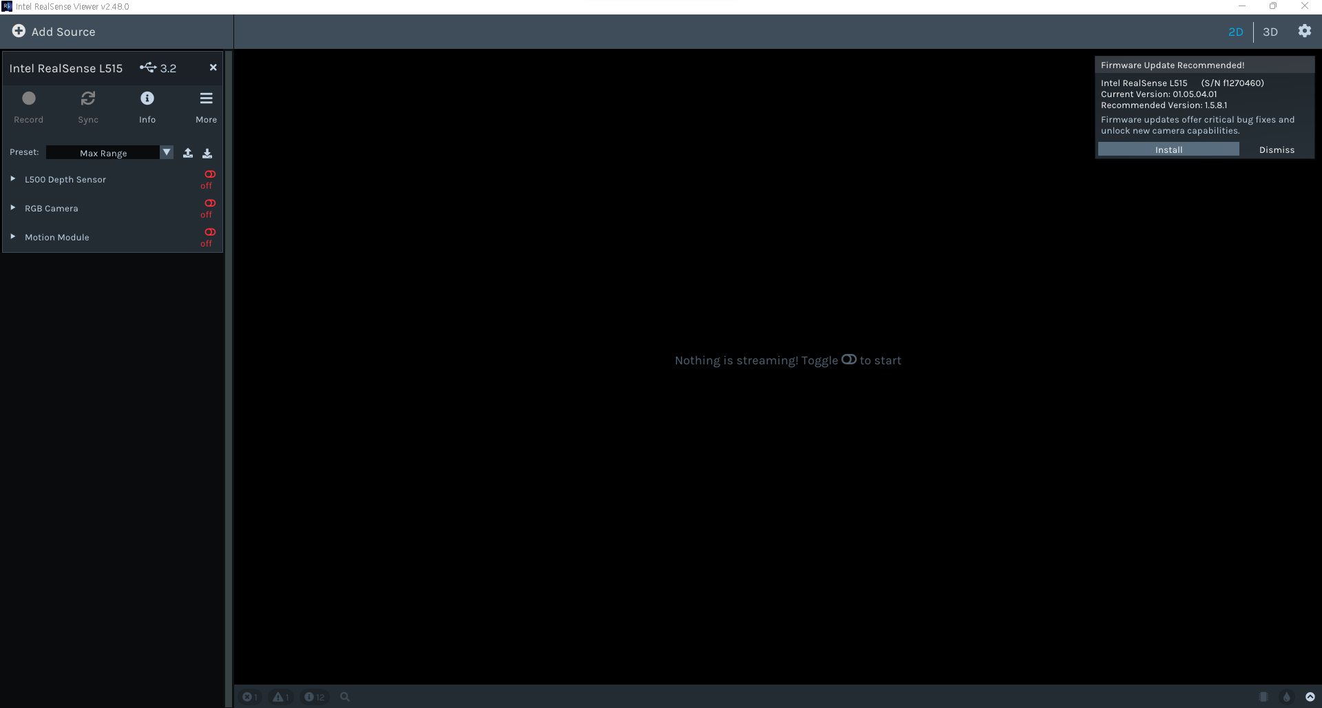 SDK 설치가 완료되었다면 Intel RealSense Viewer를 실행합니다. 처음 설치를 진행하시는 분이라면 최신 펌웨어를 설치하라는 메시지가 오른쪽 상단에 출력 됩니다. 개발 환경에 따라 설치를 진행 합니다.
