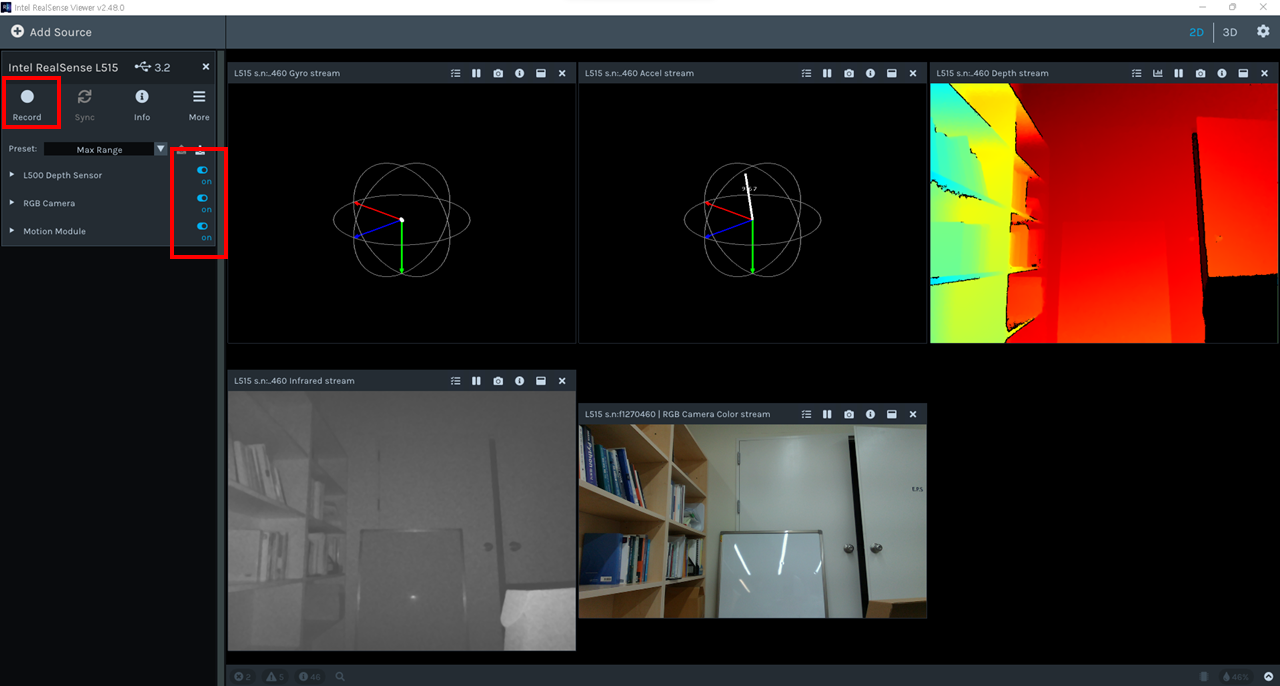 L500 Depth sensor, RGB Camera, Motion Module을 ON하면 카메라 화면이 출력 됩니다. 그 후 상단의 Record 버튼을 클릭하면 녹화가 진행 되며, 파일 포멧은 Bag 확장자 형태로 저장이 됩니다.