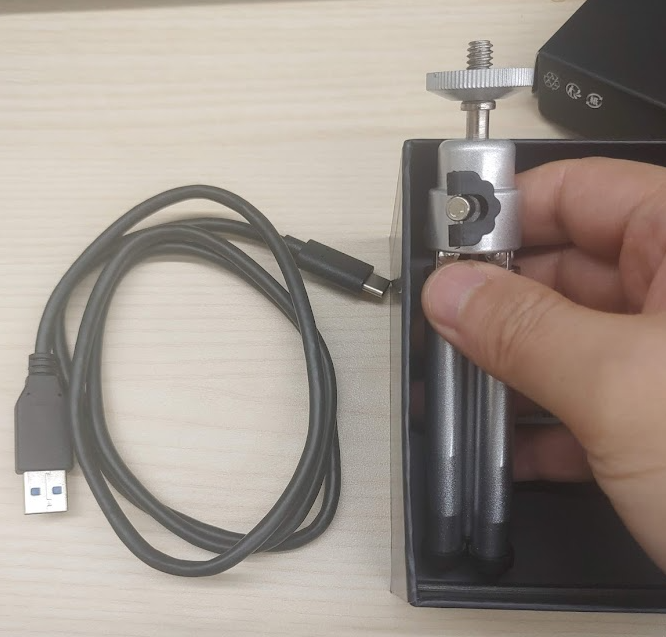 본체 아래에는 USB 3.0 to USB C 3.2 변환 선과 미니 삼각대가 들어 있습니다.