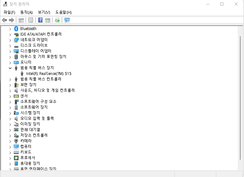 연결이 완료되면 장치관리자에서 자동으로 intel RealSense 515가 잡히는 것을 확인 할수 있습니다.