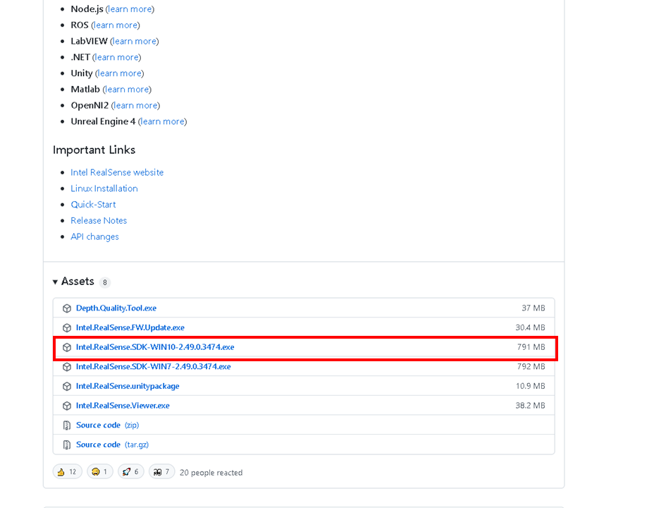 이제 레코딩과 뷰어프로그램을 설치를 해보겠습니다. https://github.com/IntelRealSense/librealsense/releases/ 로 접속해서 최신버전의 SDK를 받습니다. SDK를 설치하면 펌웨어, 뷰어 조금더 쉽게 실행 할수 있습니다.