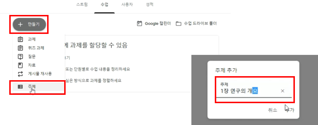 5. 수업 메뉴에서 만들기-> 주체를 입력 -> 주제의 제목을 입력합니다.