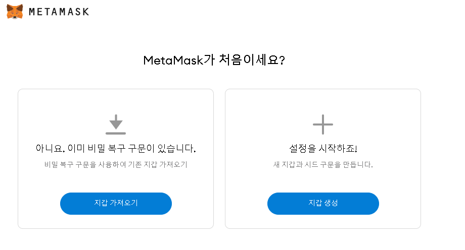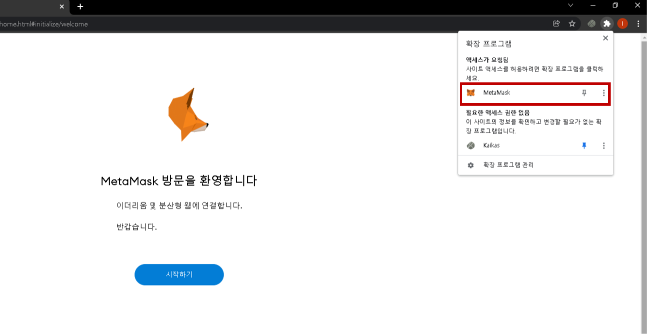 5. 브라우저 오른쪽 상단 크롬 확장 프로그램에서 MetaMask 아이콘을 찾아서 클릭 합니다. "시작하기" 버튼을 클릭 합니다.