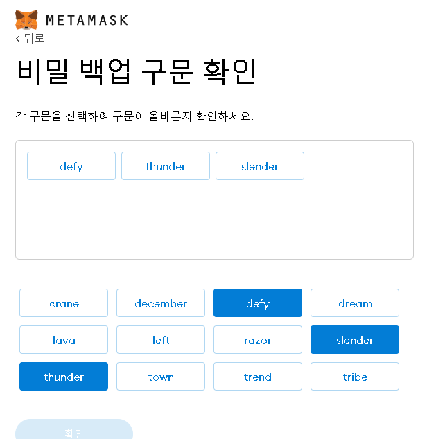 11. 시크릿 키와 동일한 순서로 단어를 선탁하고, 확인 버튼을 클릭하면 지갑 생성이 완료가 됩니다.