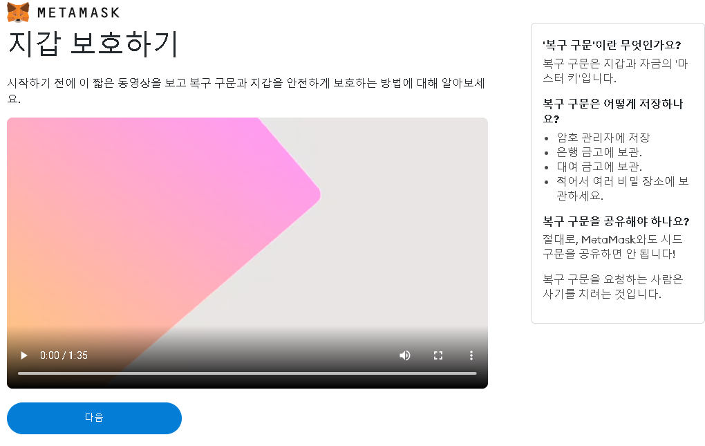 9. 지갑 보호하기 동영상을 숙지후 다음 버튼을 클릭 합니다.