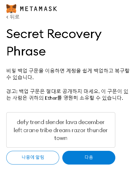 10. 비밀 문구가 생성이 됩니다. 이 비밀 문구를 잃어버리면 지갑을 대한 소유권을 잃어버리니 안전한 곳에 잘 저장을 해야 합니다.