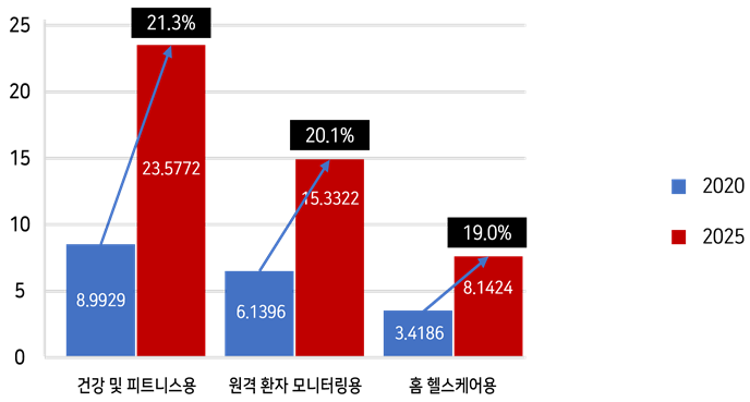 디지털 헬스케어 기술 중 가장 많이 사용되고 있는 웨어러블 디바이스의 경우 용도에 따라 건강 및 피트니스용, 원격 환자 모니터링용, 홈 헬스케어용으로 분류되며 이들 기술은 생체신호(심박수, 혈당, 수면 등) 모니터링을 통한 건강관리 서비스를 제공하며 연평균 20%의 시장 성장률로 빠르게 성장하고 있음