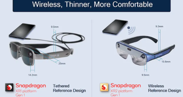 Wireless AR Smart Viewer는 Qualcomm의 초기 스마트 안경 디자인은 고성능 칩셋과 USB-C 케이블 대신 Wi-Fi 6/6E 및 Bluetooth를 사용하여 시스템을 연동 한다. Qualcomm은 소비자용 버전이 다르게 설계될 수 있다고 말하지만 잠재적으로 매우 짧은 배터리 수명의 절충안과 함께 제공 된다고 한다.