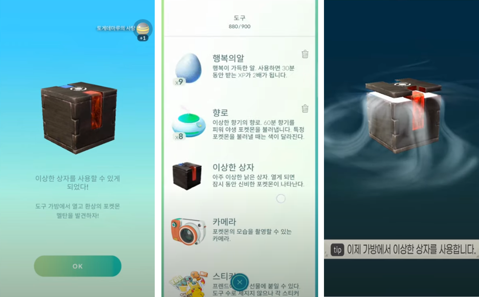 포켓몬 전송이 완료되면 이상한 상자를 얻게 됩니다. 도구로 이동해서 이상한 상자를 사용 하도록 합니다.