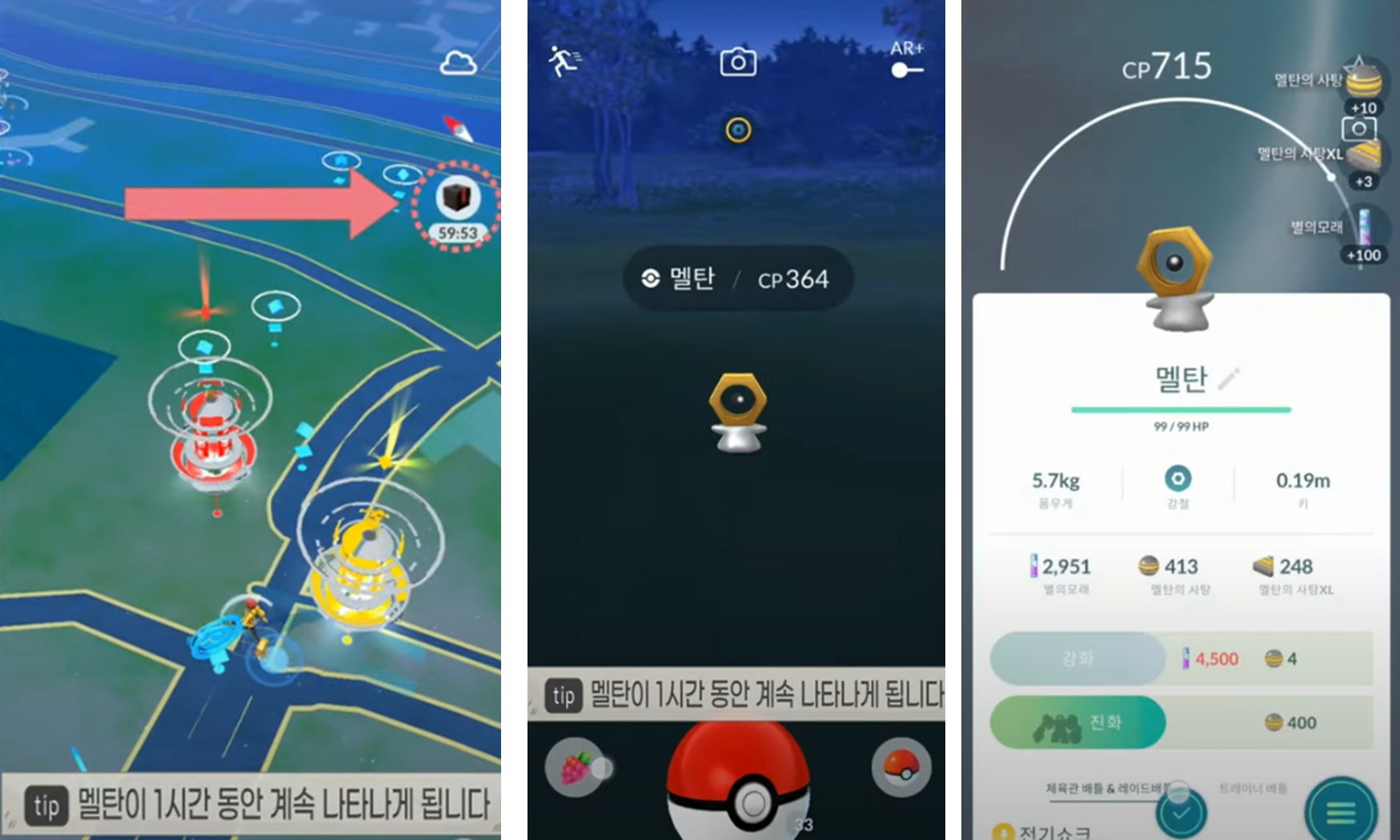 그럼 1시간동안 멜탄이 계속 나타나게 됩니다. 파인 열매를 많이 모아두고 1시간동안 사용하면서 같이 잡으면 대략 400개 정도 멜멜탄으로 진화 시킬수 있는 사탕을 얻을수 있습니다.