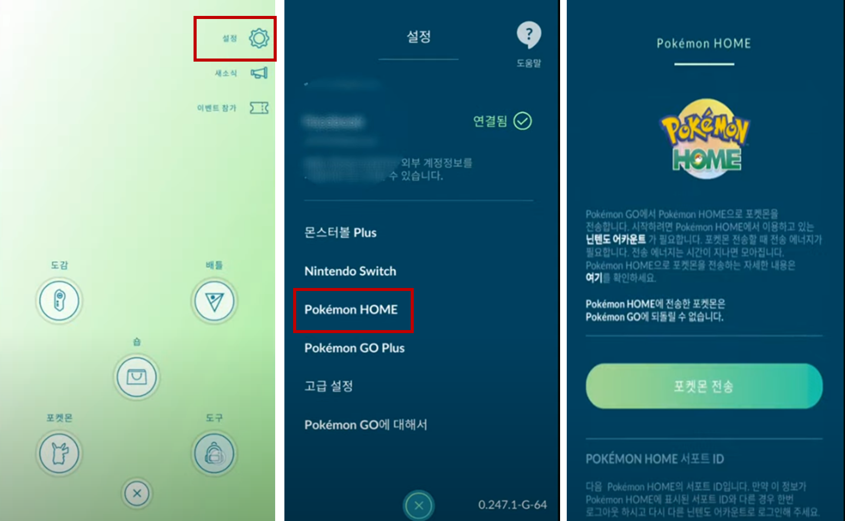 포켓몬 홈의 회원가입을 완료 하였다면 포켓몬 고로 돌아와 설정 -> Poketmon Home으로 이동 합니다. (설정 창 맨하단)