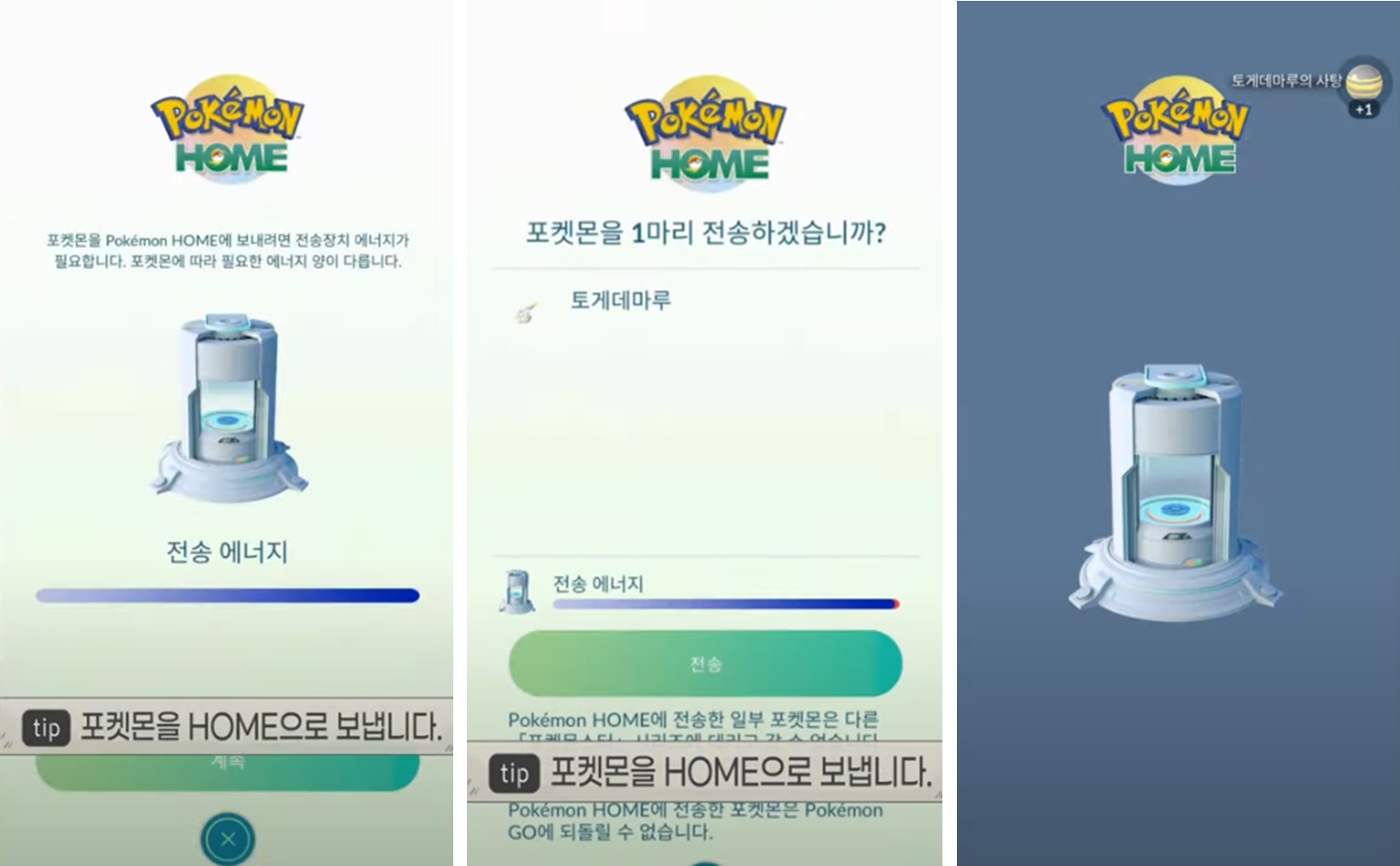 한번 포켓몬 Home으로 전송한 포켓몬은 다시 포켓몬 Go로 되돌아 올수 없으니 관상용 포켓몬만 전송하도록 합니다.