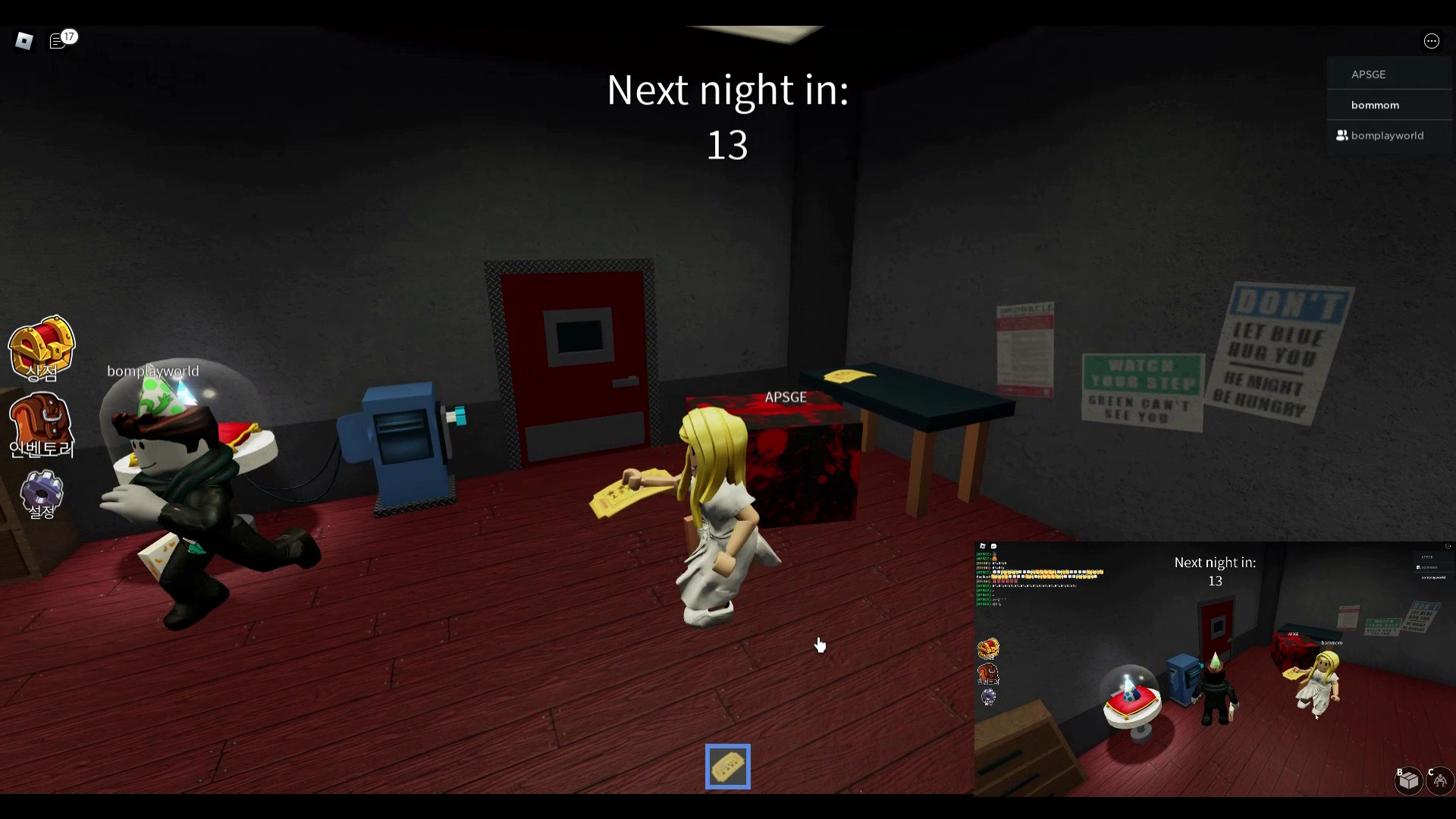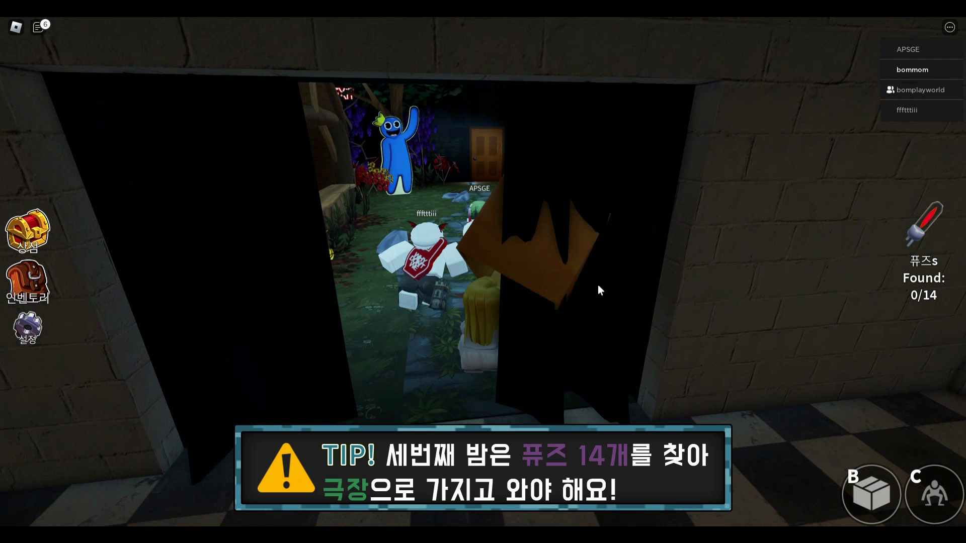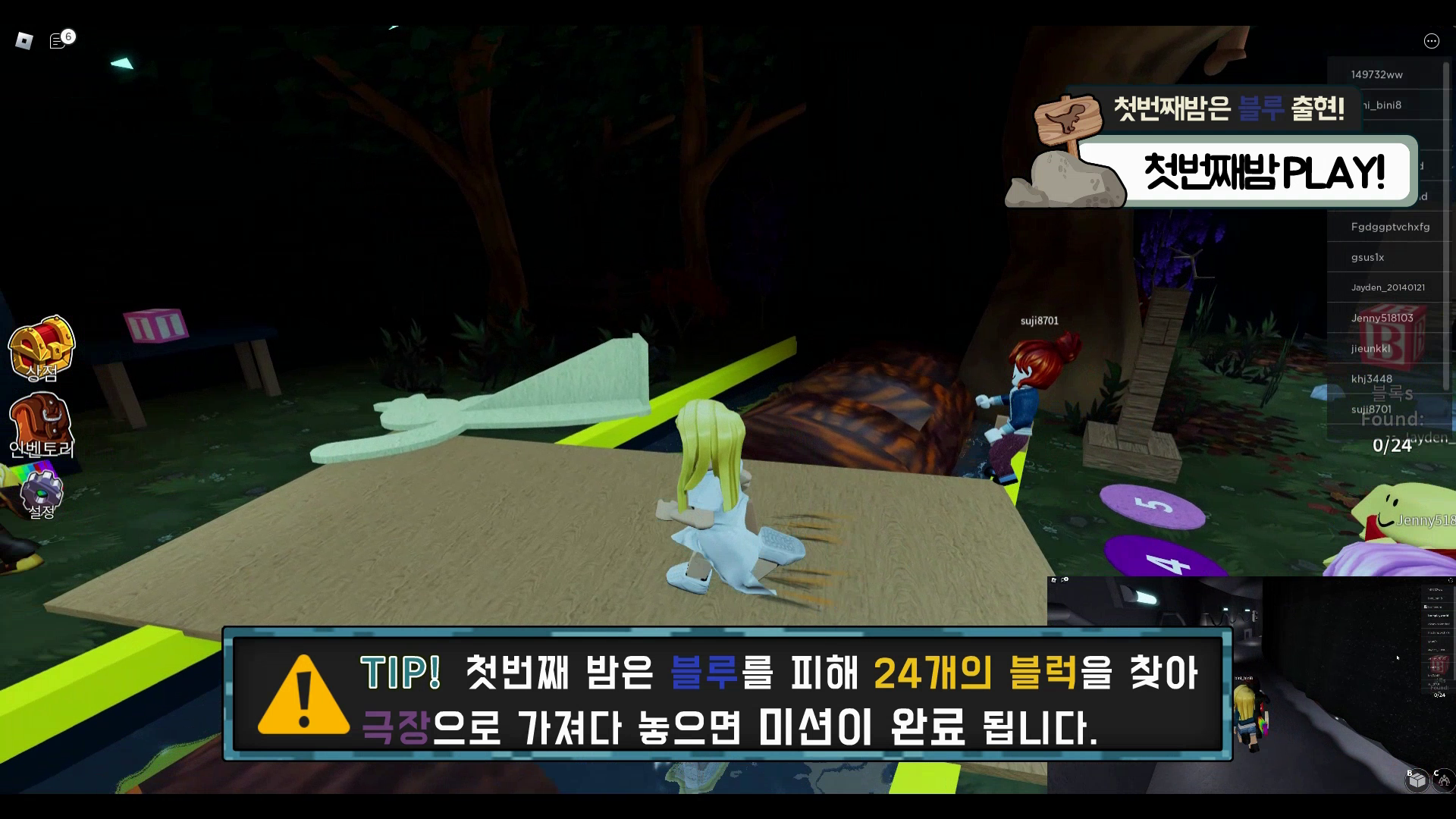 첫 번째 밤은 블루를 피해 24개의 블록을 찾아 극장으로 가져다 놓으면 미션이 완료됩니다.