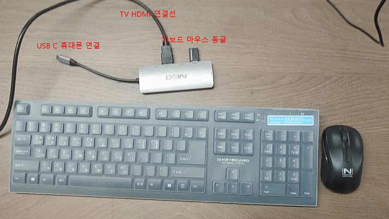 그 후 데이터 변환 어댑터에 TV의 HDMI 선을 연결하고, 키보드 마우스를 사용하기 위해 블루투스 무선 동글을 연결 하였습니다.