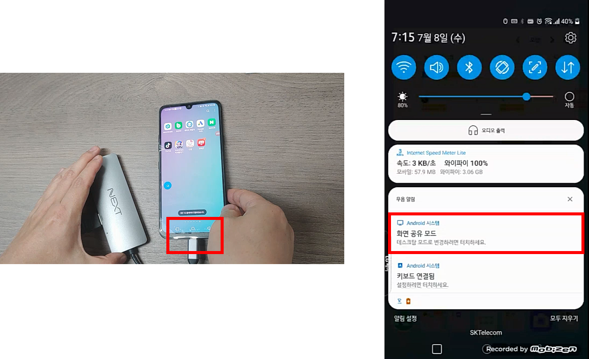 이제 데이터 변화 어댑터에 USB-C 타입의 단자를 휴대폰에 연결합니다. 그리고, 휴대폰 상단의 메뉴 알람창에 화면 공유 모드 메시지가 출력된 것을 확인할 수 있습니다. "데스크톱 모드로 변경하시려면 터치하세요."라고 자세하게 설명을 해주고 있습니다.