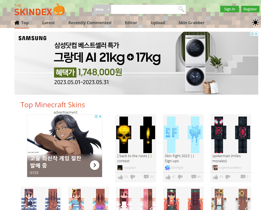 스킨덱스도 역시 무료 스킨을 제공하고 있으며, 스킨을 다운로드하여서 바로 수정도 가능 한 사이트입니다. 홈페이지 메뉴가 단조로운 편으로 사용하기에는 편리합니다. 그러나 전체적으로 스킨이 너무 깨져서 보이기 때문에 무료로 제공되는 스킨의 캐릭터를 식별하기가 조금 어려운 편입니다.